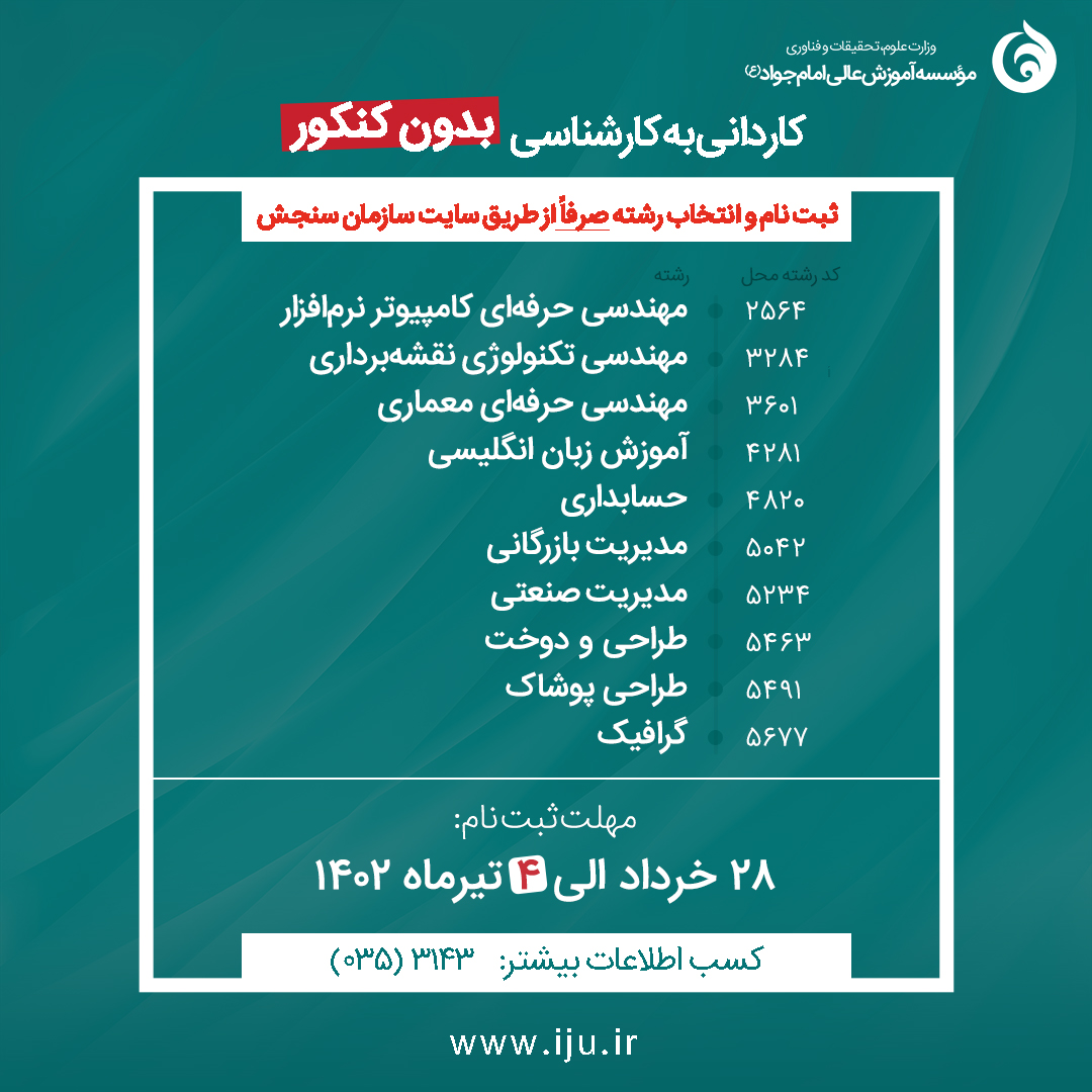 به اطلاع متقاضیان ثبتنام و شرکت در آزمون کاردانی به کارشناسی ناپیوسته سال ۱۴۰۲ میرساند ثبتنام از روز یکشنبه به تاریخ ۱۴۰۲/۳/۲۸ آغاز و تا روز یکشنبه به تاریخ ۱۴۰۲/۴/۴ ادامه خواهد یافت. متقاضیانی که دارای شرایط عمومی و اختصاصی مندرج در دفترچه راهنمای ثبتنام و انتخاب رشته هستند، میتوانند در آزمون مذکور ثبتنام نمایند. دفترچه راهنمای ثبت نام و انتخاب رشته همزمان با شروع ثبتنام از طریق درگاه اطلاعرسانی این سازمان قابل دسترس است.